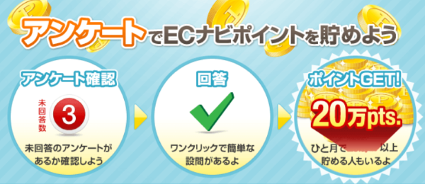 ECナビは、ネットショッピングやアンケート、アプリの利用などでポイントを貯められる無料のポイントサイトです。