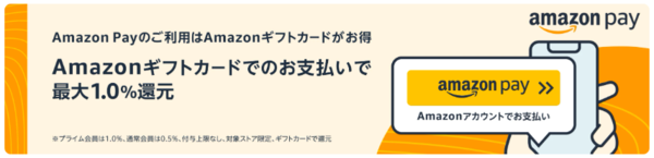 Amazon Payでの寄付の際に、Amazonギフトカードを利用すると、寄付額に応じて最大1.0%分のAmazonギフトカードがもらえるキャンペーンです。