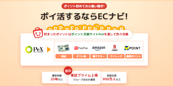 | ECナビ | 5,000ポイント(500円相当) | 10ポイント=1円相当 | 数日から1週間 | 50円 | PeX経由でPayPayマネーライトに交換可能 |